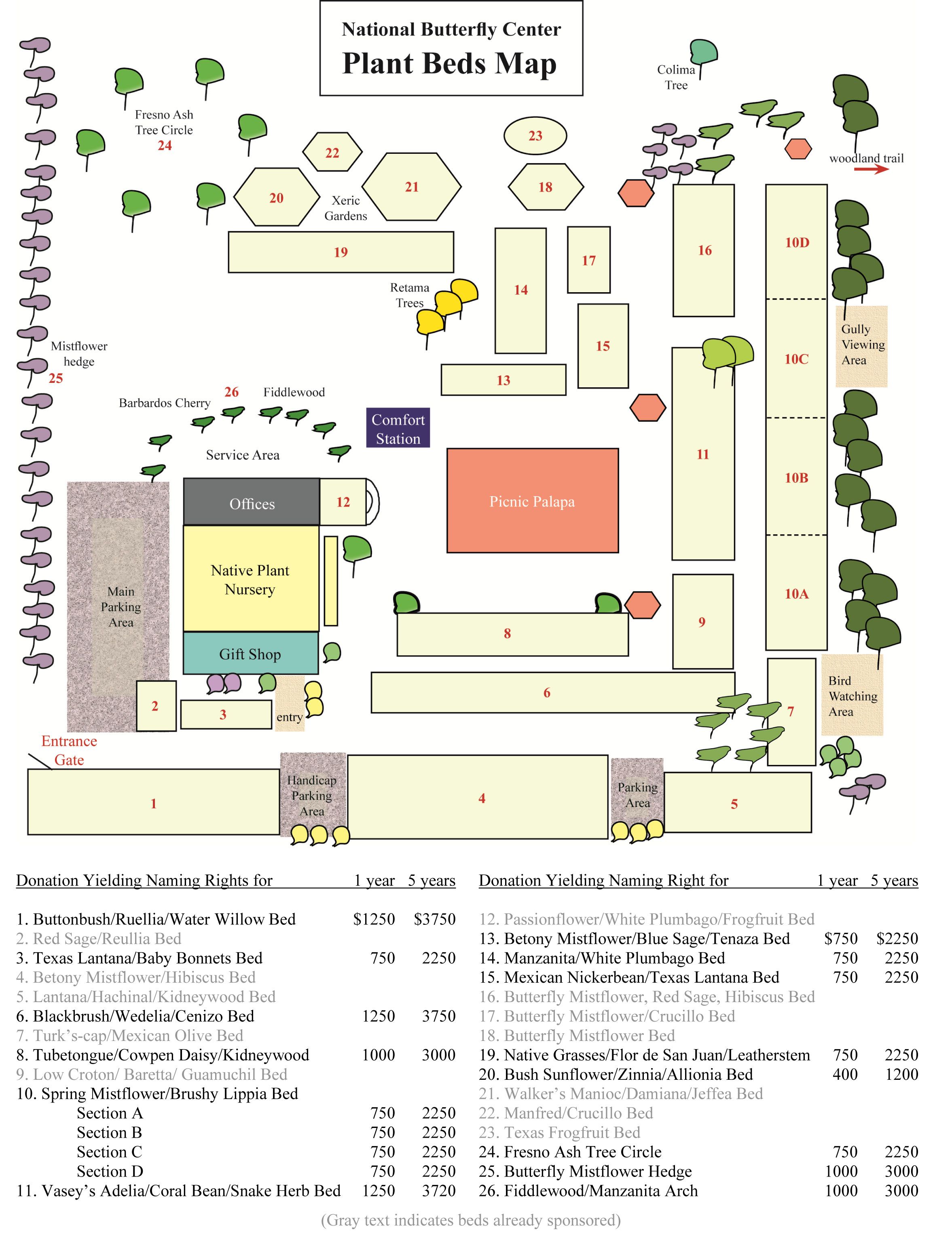 You can help us grow and maintain the gardens by adopting a bed for a one year or five year period. Choose the bed you wish to sponsor, and adopt it by making a donation in the dollar amount listed.